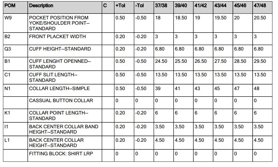 Shirt size chart